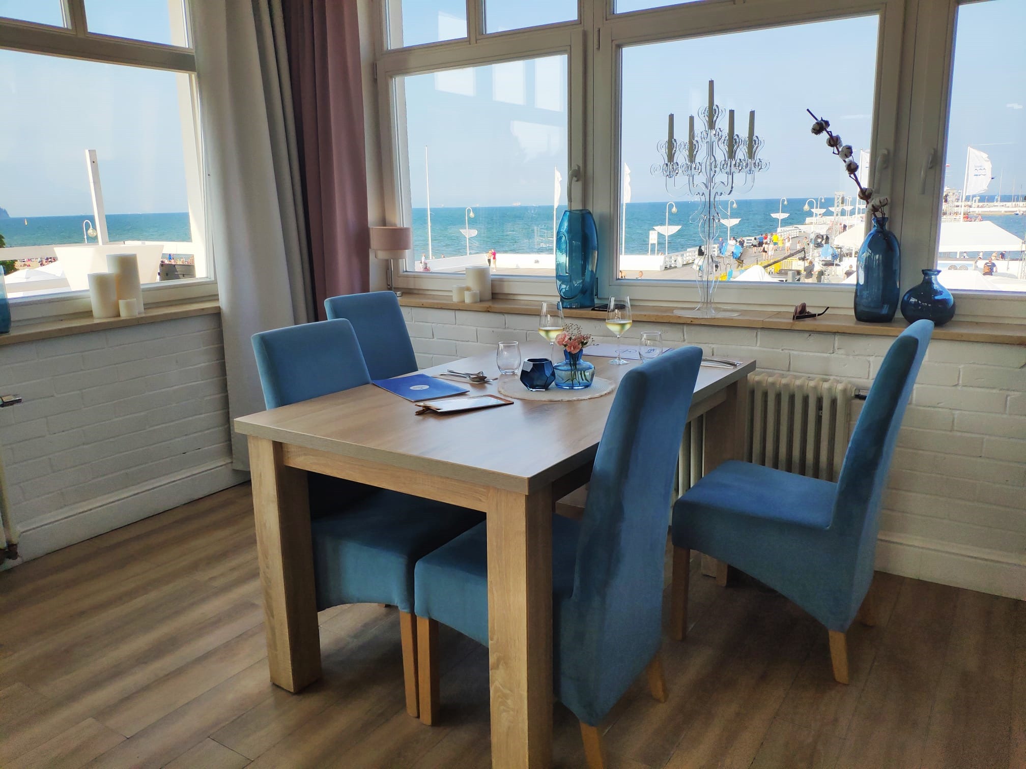 Na klif już nie zdążymy, bo o siedemnastej zarezerwował stolik w restauracji przy molo.