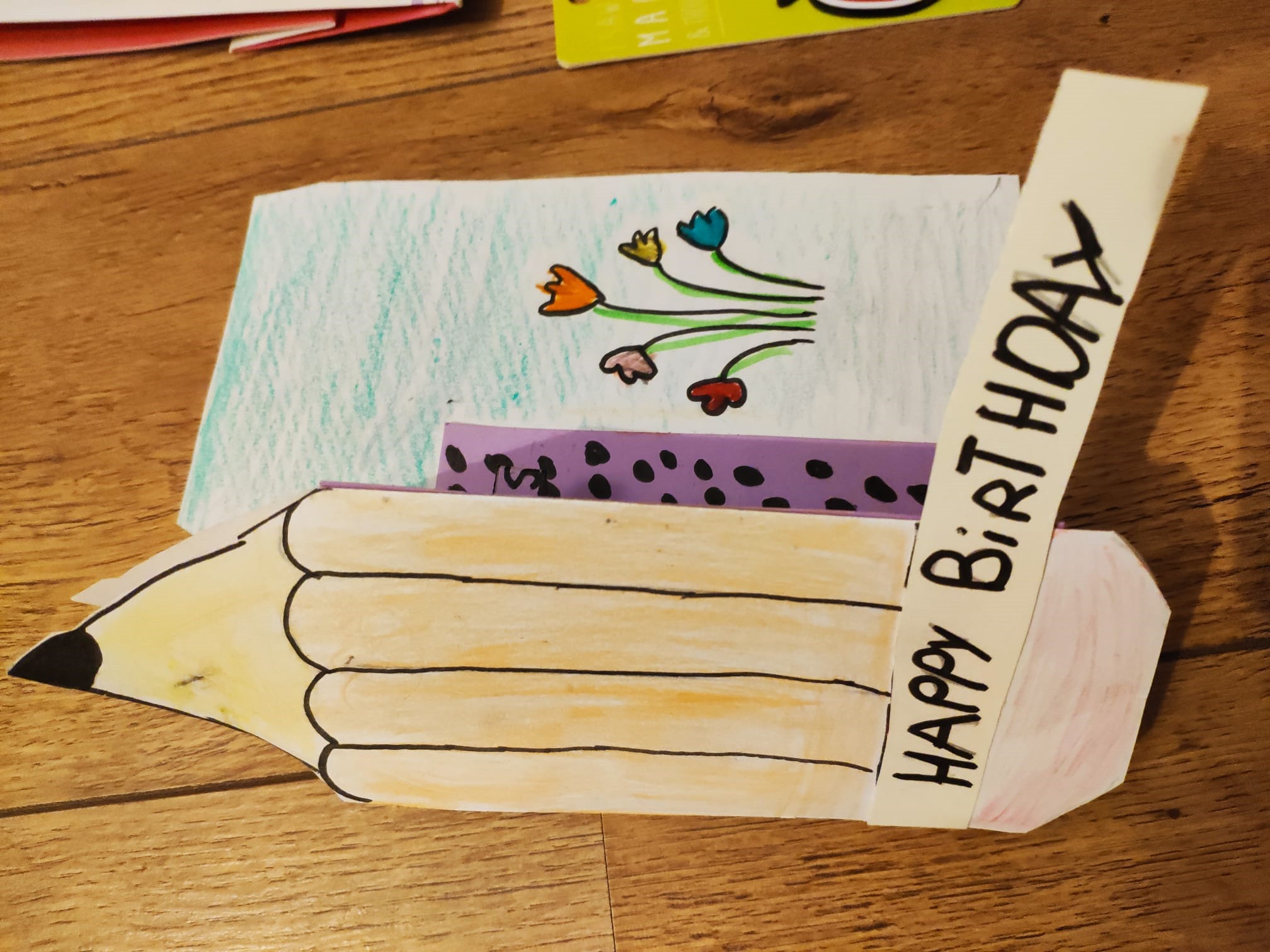 Okruszek wykonał dla juf Marije kartę urodzinową. Dołożyliśmy magnes z napisem „najlepszy nauczyciel” plus polskie śliwki w czekoladzie – to wystarczyło, w Holandii nie przykłada się do prezentów urodzinowych dużego znaczenia, jeśli w ogóle są, mają być drobne, symboliczne.