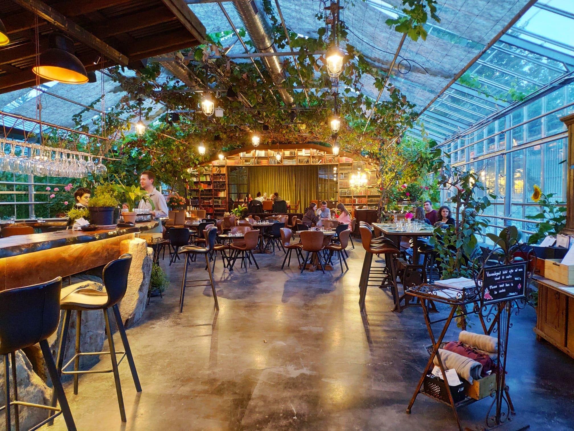 Restauracja ma oryginalny design, łączy cechy szklarni i antykwariatu.