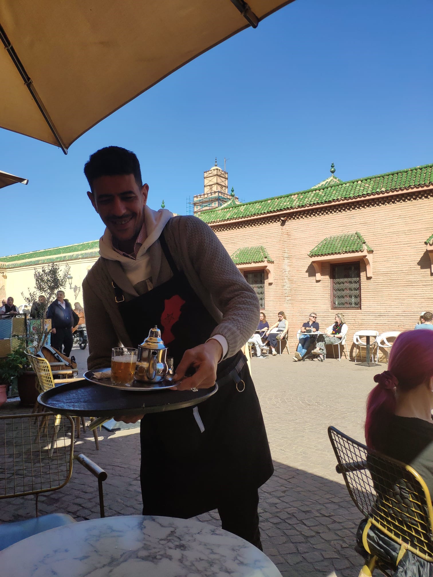 Kelner jest sympatyczny (również Berber, nie Arab, jak sam podkreśla), z własnej inicjatywy robi nam zdjęcia, a gdy zwalnia się lepszy stolik, proponuje, żebyśmy się tam przesiedli, choć nam by to nawet nie przyszło do głowy.