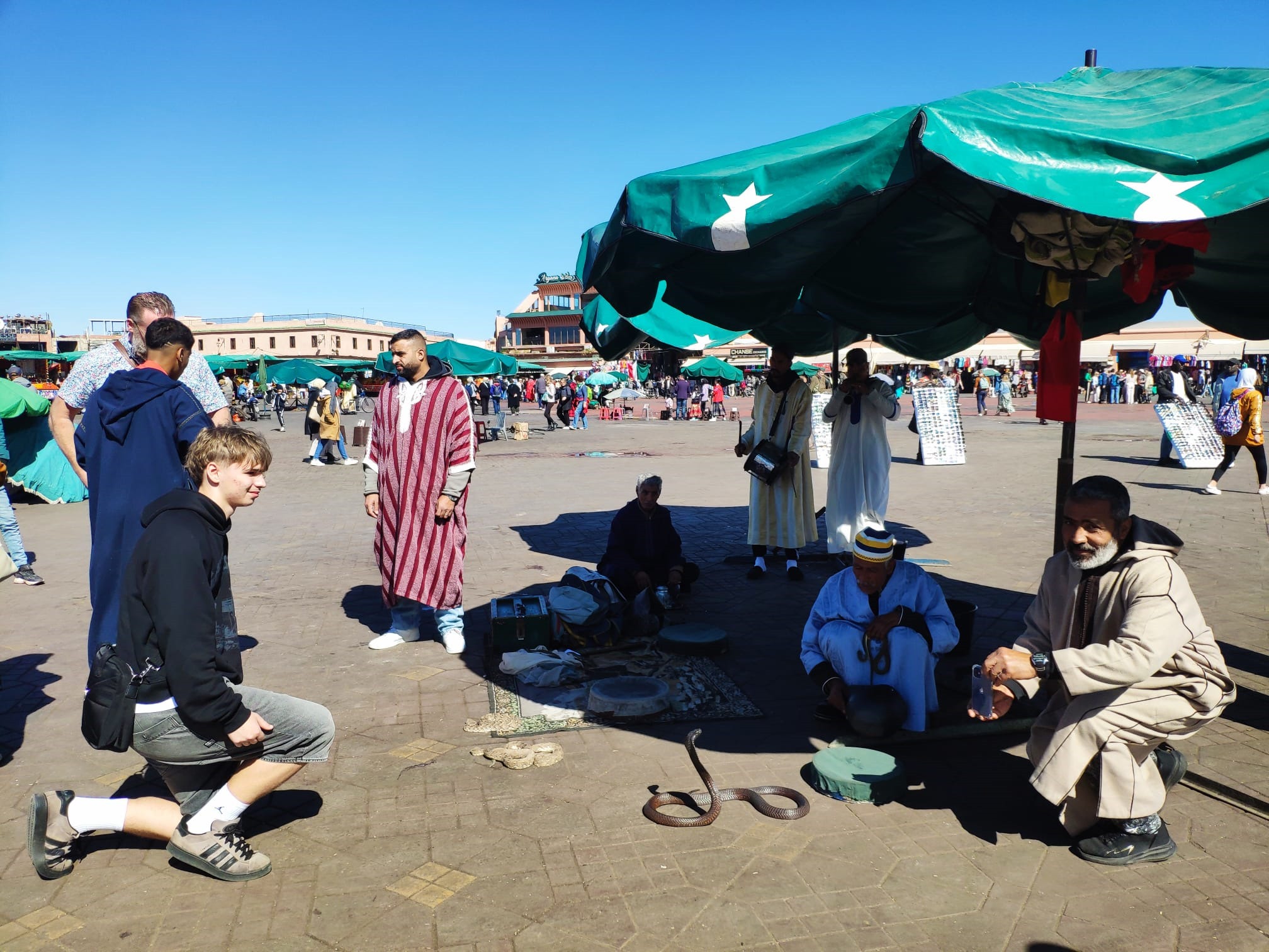 Zregenerowani udajemy się na największy plac medyny, a zarazem symbol Marrakeszu. Jest południe, Plac Dżemaa el -Fna kąpie się w strugach słońca, upał szybko daje się nam we znaki. Wszędzie panuje gwar i chaos. Wracają znajome widoki straganów, sprzedawcy wyławiają wzrokiem potencjalnych kupców i nawołują. Gdzieniegdzie leci muzyka.