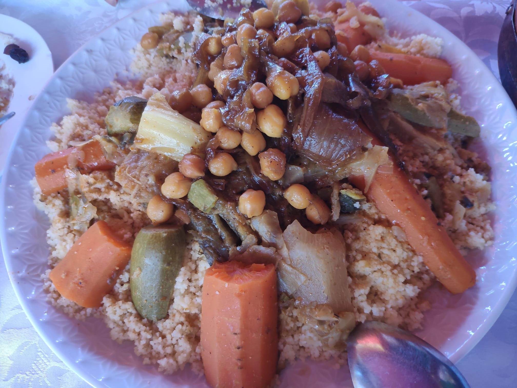 Na marokański obiad zaserwowano nam oczywiście kuskus z warzywami i udka kurczaka duszone w sosie. Na deser – plasterki pomarańczy posypane cynamonem.