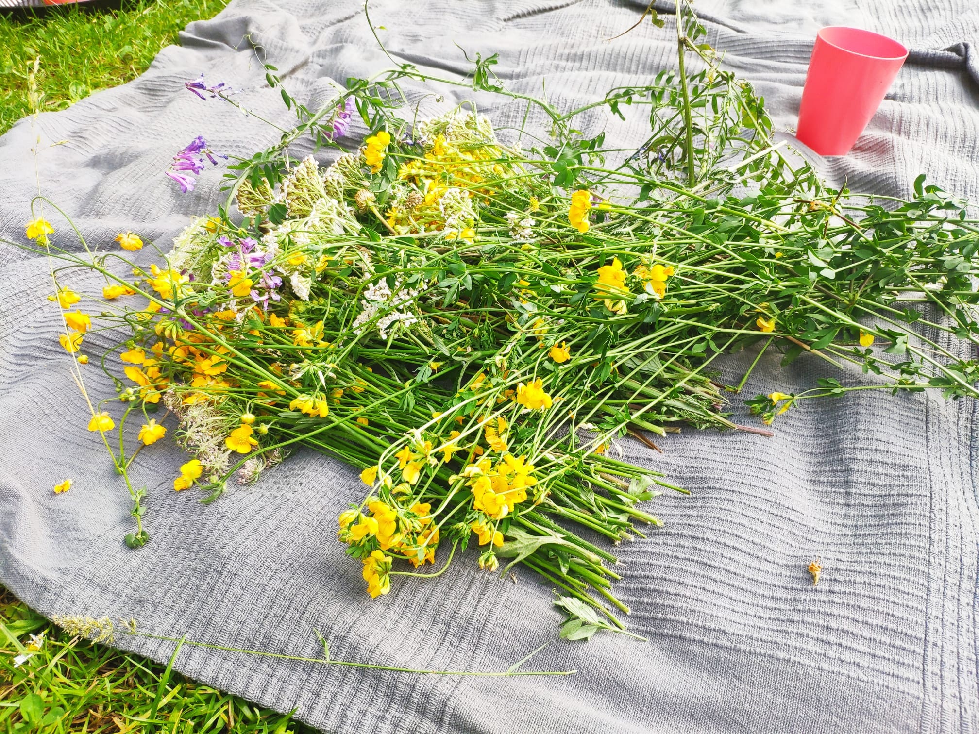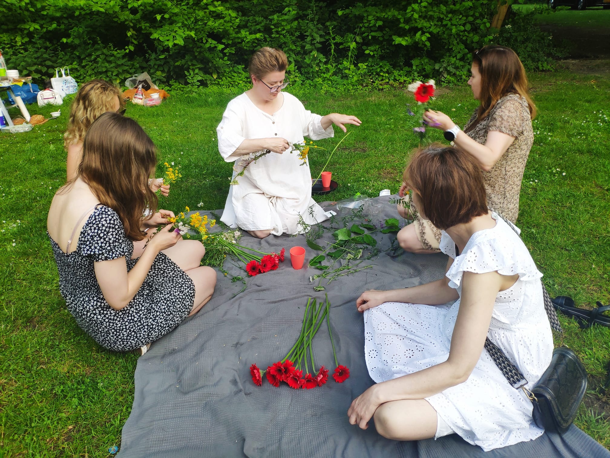 Wicie wianków okazało się niełatwe, gdyż żółte mlecze z długimi, sztywnymi łodyżkami już przekwitły. Zasiadłyśmy na kocyku wokół polnych kwiatów i wspólnie je przebierałyśmy, próbując ujarzmić niesforne listki, skomponować kolorystycznie płatki i połączyć łodygi na wzór kręgu w jakiś trwały sposób.