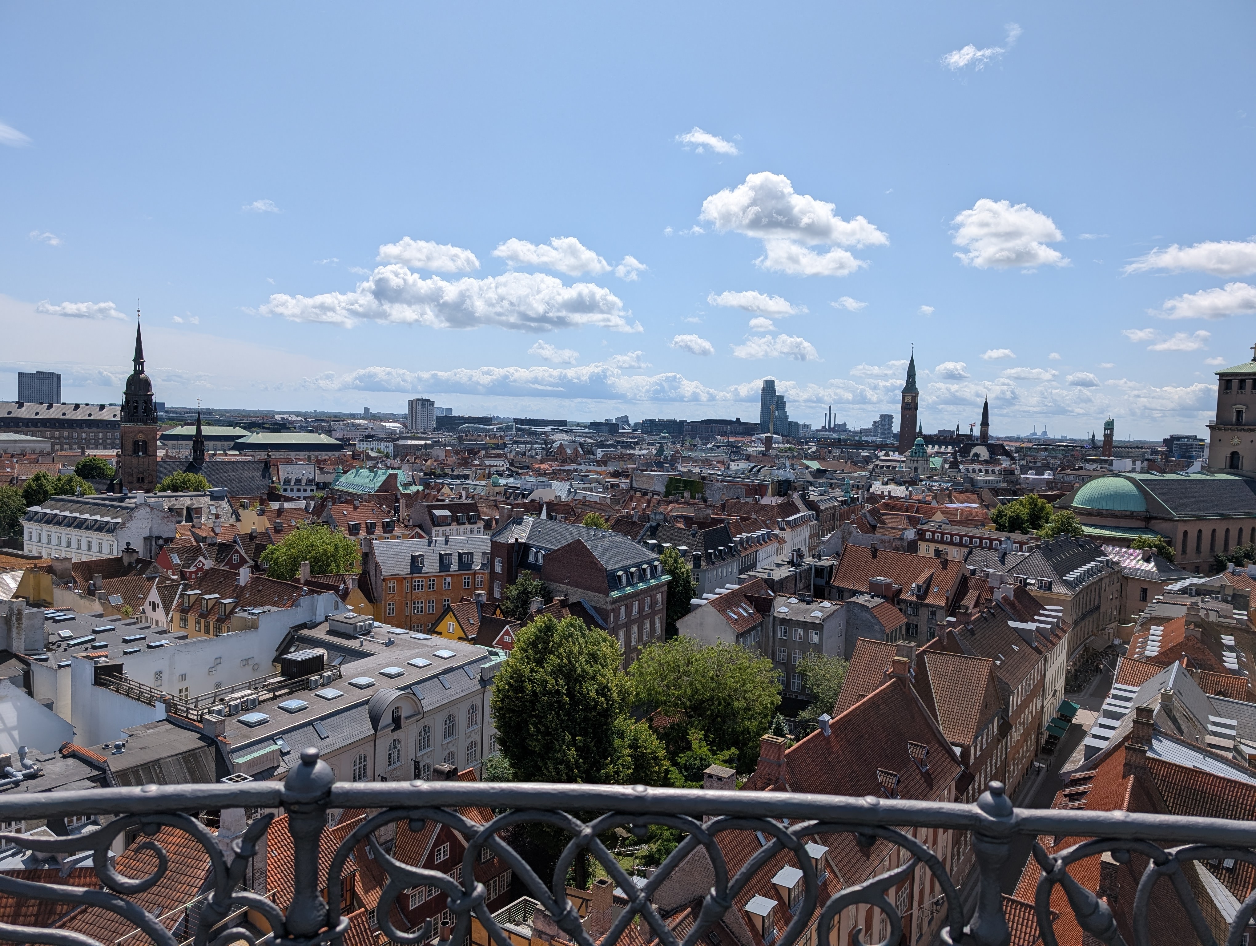 W Kopenhadze jest kilka miejsc, z których można miasto obejrzeć z góry. Osobiście odwiedziłem dwie słynne wieże. Obie dość nietypowe. Obok powszechnych dla konstrukcji tego typu spiralnych schodów wewnątrz wieży będziemy też mogli wspinać się nieco inaczej. W przypadku Okrągłej Wieży (Rundetaarn) na znacznym odcinku przemieszczać się będziemy po spiralnej rampie. Wieża ta znajduje się w samym sercu starówki, więc widok z niej jest wyśmienity. A brak schodów na znacznym odcinku sprawia, że nawet mniej wytrawni wędrowcy powinni dać radę wspiąć się na szczyt.