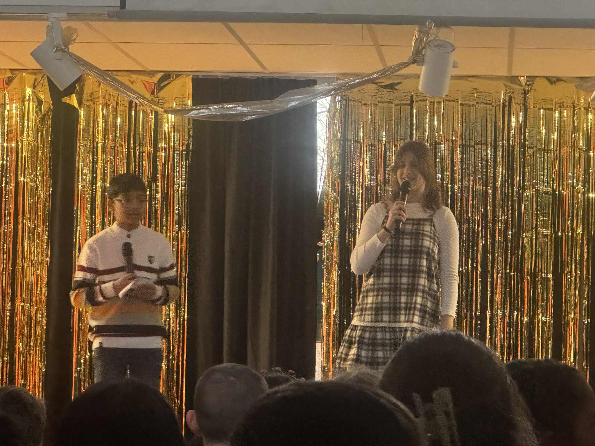 Tylko nogi nas rozbolały od stania. Za kotarą stało tylko jedno krzesło, więc jak „znikaliśmy”, to musieliśmy się nim dzielić. We dwoje się nie mieściliśmy, więc ścigaliśmy się, kto pierwszy usiądzie, jak w takiej zabawie z zajmowaniem krzesełek. A bonus imprezy był taki,  że ze sceny mieliśmy świetny widok na  publiczność, czyli widzieliśmy wszystkich uczniów, nauczycieli, a także rodziców. Mogliśmy podejrzeć to i owo, na przykład kto robi najwięcej zamieszania. Tu was zaskoczę – nie dzieci! Winking smile