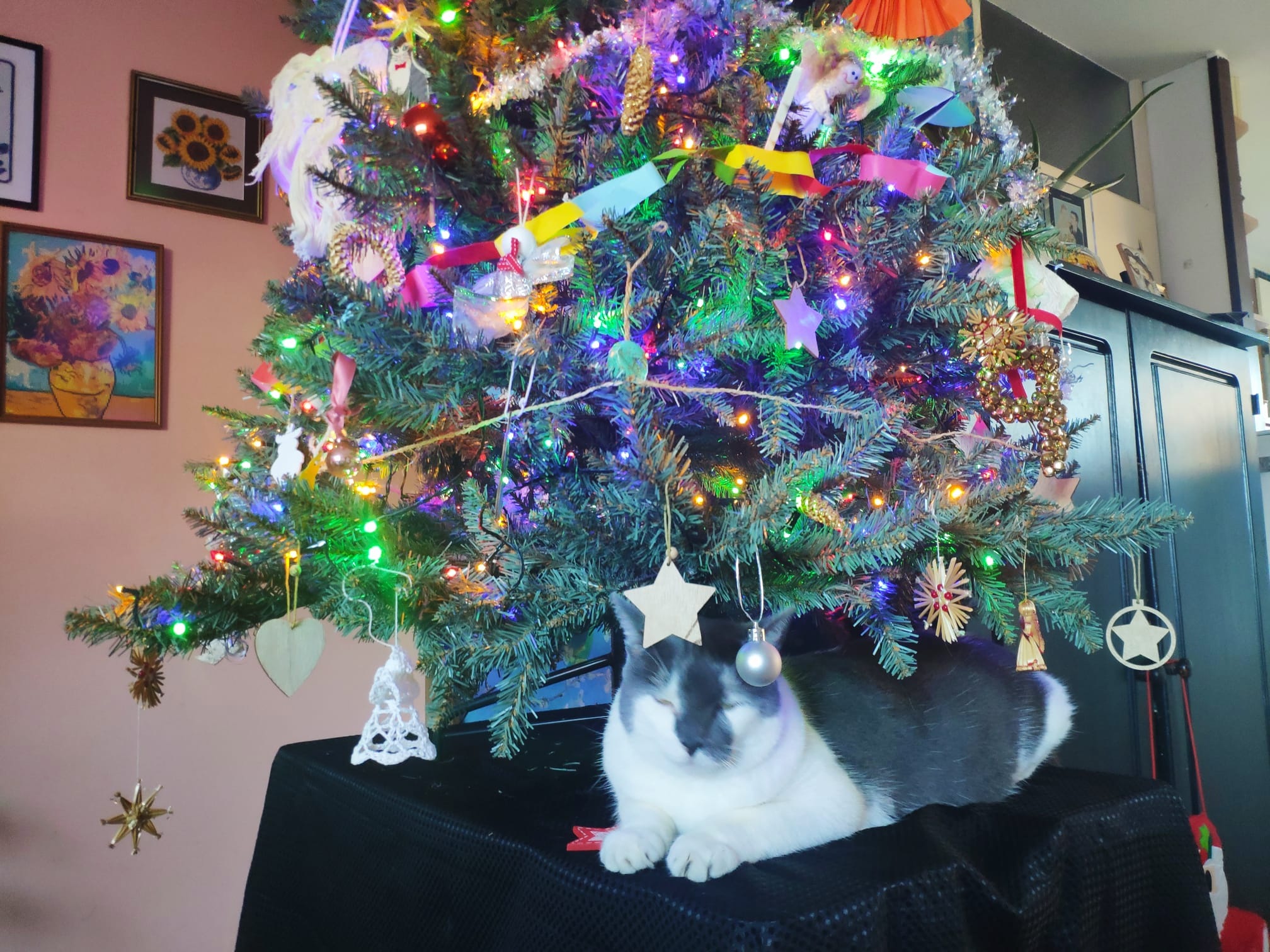 Żeby kot był syty i mysz cała, to znaczy: żeby kot był zadowolony i choinka stała (a nie przewracała się przez jego skoki), zawarliśmy układ: Guzikowi wolno leżeć wyłącznie pod choinką.