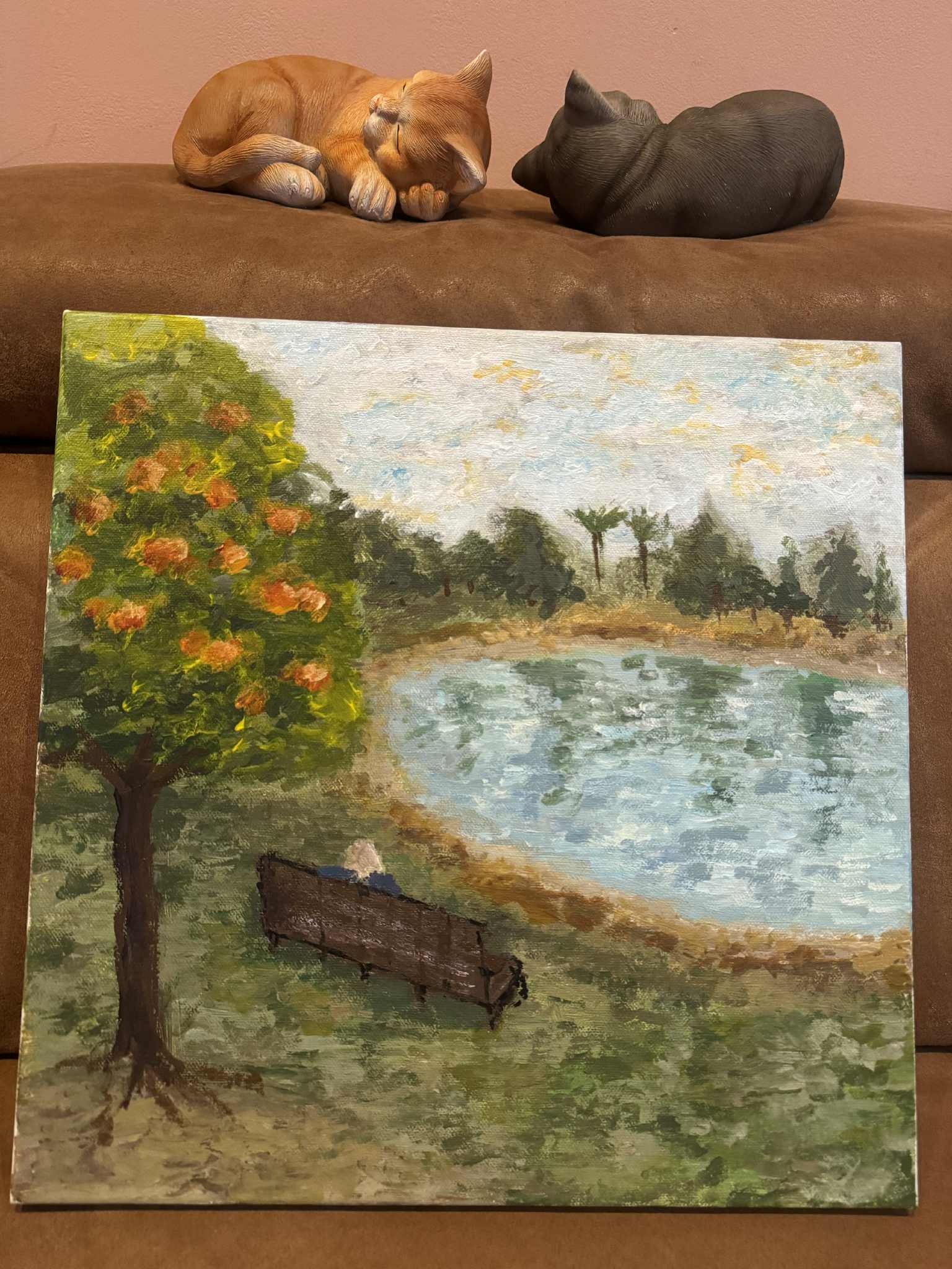 Dzieci przygotowały mi piękne podarki (Iskierka namalowała obraz: mnie siedzącą na ławce pod drzewkiem pomarańczowym w Maroku, Okruszek – mój portret w stylu animy, a Groszek – laurkę z naszym kotem).